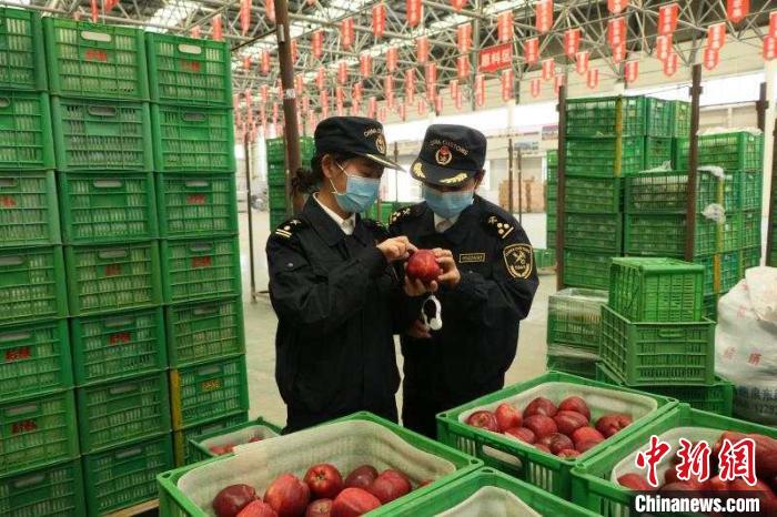 圖為3月底,蘭州海關(guān)工作人員對出口蘋果進行抽檢。蘭州海關(guān)供圖