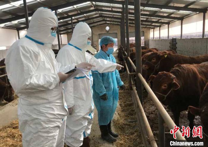 3月下旬,蘭州海關(guān)所屬平?jīng)龊jP(guān)對甘肅農(nóng)特產(chǎn)品進行點對點幫扶,精準(zhǔn)指導(dǎo)并解決企業(yè)困難。圖為蘭州海關(guān)工作人員在活牛育肥基地進行日常檢疫管理。蘭州海關(guān)供圖