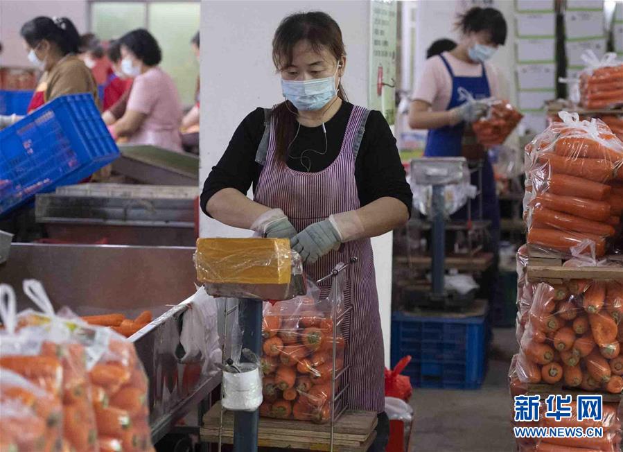 4月21日,在福建泉州南安市石井鎮(zhèn)鑫冠禾農(nóng)業(yè)開發(fā)有限公司,胡蘿卜初加工生產(chǎn)線上的工人將洗凈的胡蘿卜裝袋。