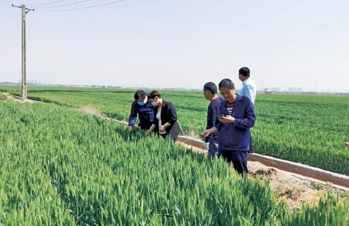 新鄉(xiāng)縣農技工作人員在察看小麥長勢。