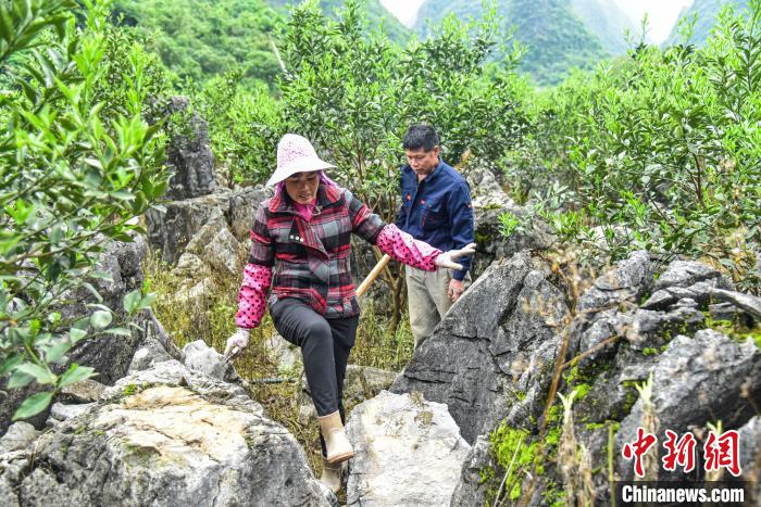 以前,黃美鮮在外面務(wù)工,開過塔式起重機(jī),開過汽修廠,收入還算不錯,也攢了一些積蓄。通過了解,她發(fā)現(xiàn)家鄉(xiāng)特產(chǎn)“融安金桔”的產(chǎn)值效益不錯,于是就有了回鄉(xiāng)創(chuàng)業(yè)的念頭。沙子鄉(xiāng)地處滇桂黔石漠化片區(qū),屬于喀斯特地貌,極少連片土地?粗鴮訉盈B疊的石山,黃美鮮決定在石山之間的縫隙里開荒種植金桔。