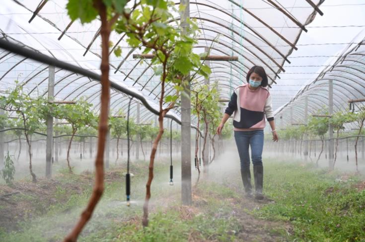 4月11日,毛富枝在星溪鄉(xiāng)東峰大棚陽光玫瑰葡萄種植標(biāo)準(zhǔn)化示范基地勞作。
