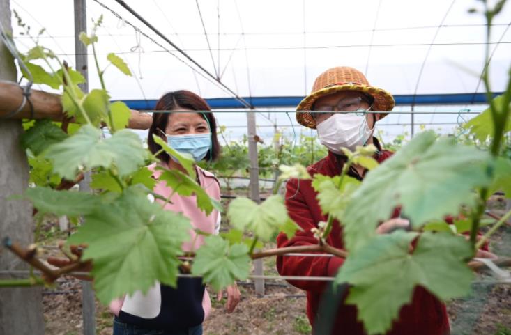 4月11日,毛富枝(左)和基地技術(shù)管理人員鄧久童探討解決葡萄生長中存在的問題。