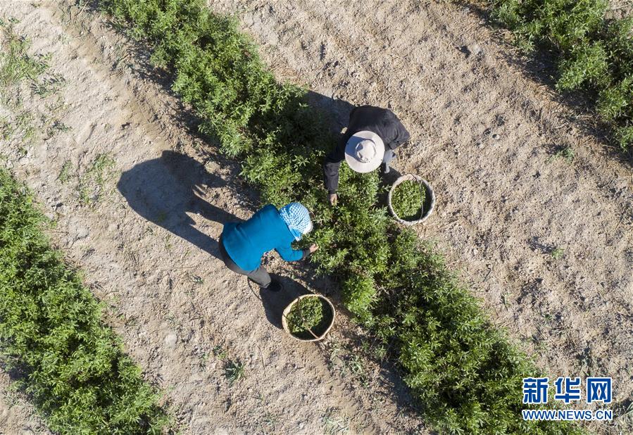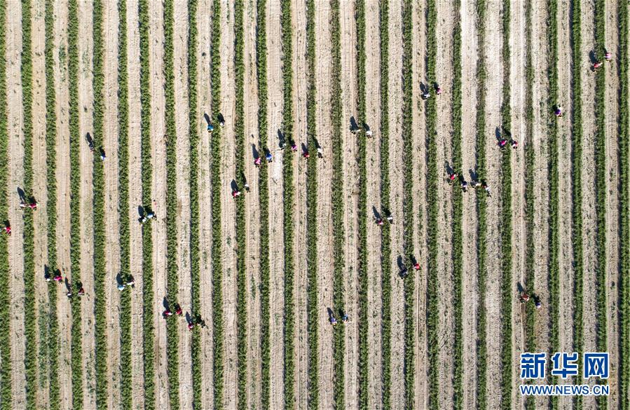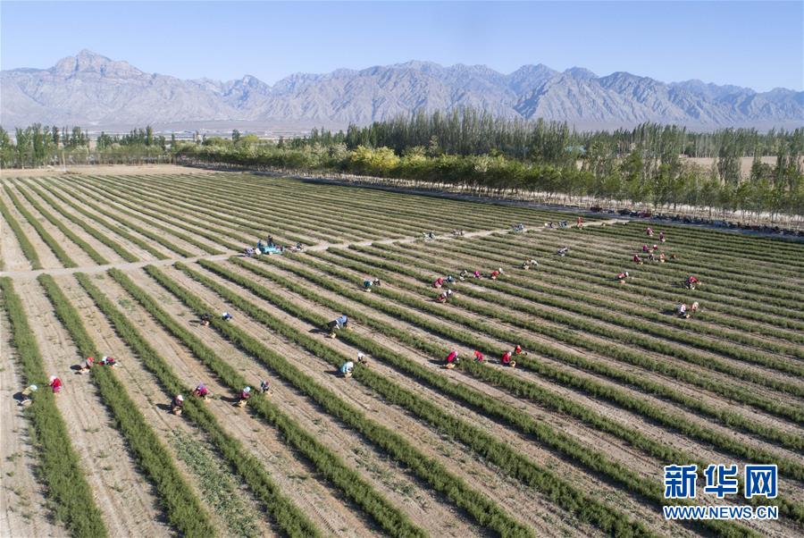 5月11日,采茶工在寧夏百瑞源賀蘭山基地采摘枸杞芽茶(無人機照片)。