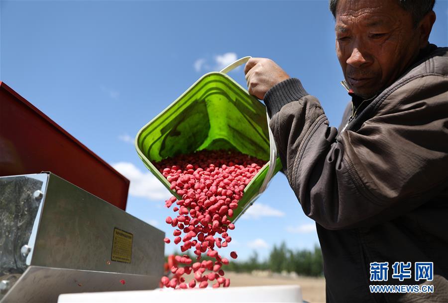 5月12日,臺(tái)安縣洪家農(nóng)牧場的一名工人往農(nóng)機(jī)里投放花生種子。