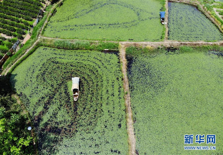 5月13日,村民在杭州西湖區(qū)雙浦鎮(zhèn)湖埠村水塘的小船上采摘西湖莼菜(無人機(jī)照片)。