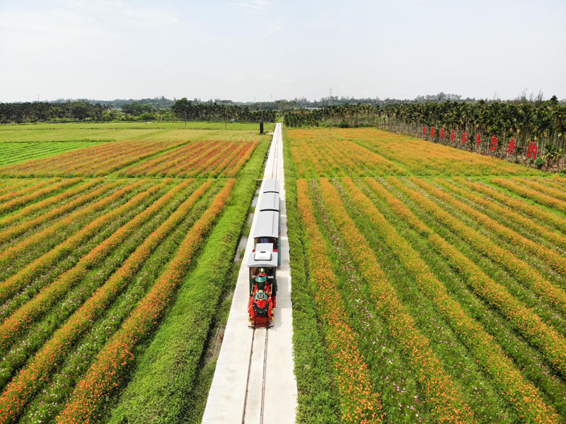 5月20日,海南瓊海龍壽洋國家農(nóng)業(yè)公園的觀光小火車在花海中穿梭(無人機(jī)照片)。