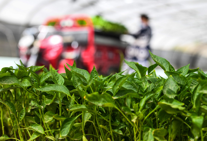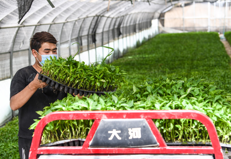 農(nóng)民在位于新疆和田縣塔瓦庫勒鄉(xiāng)巴克墩村的辣椒育苗基地大棚搬運辣椒苗(5月16日攝)。新華社記者 王菲 攝