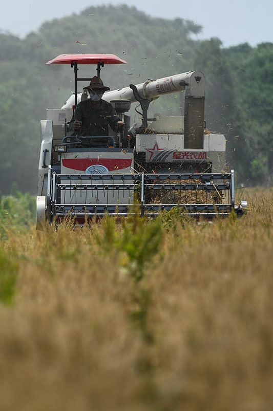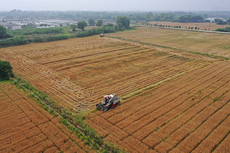 5月24日,農(nóng)戶駕駛收割機在浙江省湖州市吳興區(qū)八里店鎮(zhèn)尹家圩糧油植保農(nóng)機專業(yè)合作社的麥田里進行收割作業(yè)。