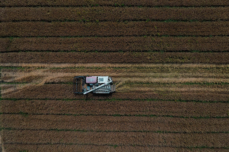 5月24日,農(nóng)戶駕駛收割機在浙江省湖州市吳興區(qū)八里店鎮(zhèn)尹家圩糧油植保農(nóng)機專業(yè)合作社的麥田里進行收割作業(yè)(無人機照片)。