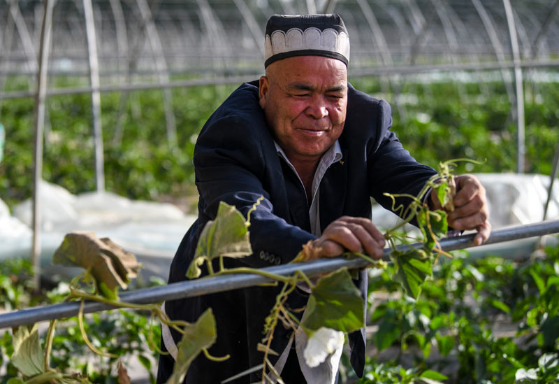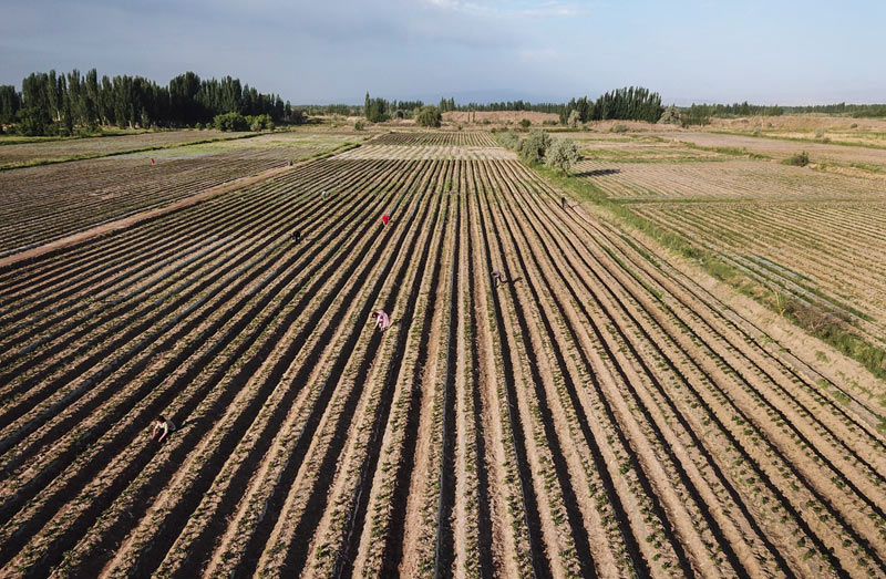 在新疆莎車縣烏達(dá)力克鎮(zhèn)博依拉村,農(nóng)民在田間勞作(5月23日攝)。新華社記者 王菲 攝