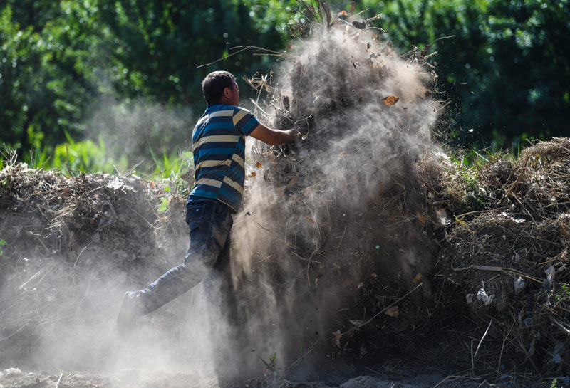 在新疆莎車縣伊什庫力鄉(xiāng)闊坦墩村,一名農(nóng)民在大田旁制作堆肥(5月22日攝)。新華社記者 王菲 攝
