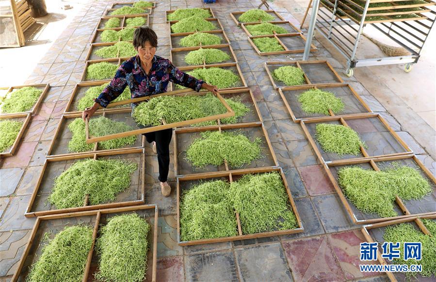 6月3日,在河北省石家莊市行唐縣玉亭鄉(xiāng)高嶺村匯海家庭農(nóng)場(chǎng),農(nóng)戶在晾曬金銀花。