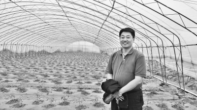 圖①:2016年5月,趙江輝站在經(jīng)堂村玫瓏瓜大棚前。