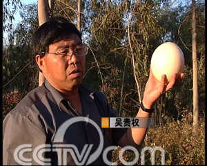 吳貴權(quán):“飼養(yǎng)員的話,不太注意,不耐心的觀察,就知道有蛋了,爬進(jìn)去就撿,一撿鴕鳥一來,它那個(gè)腿就要踢人。”