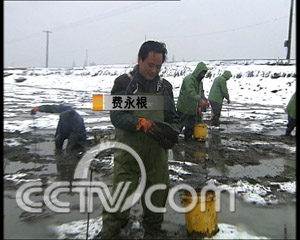 原來這些人正在摸甲魚,這100多畝的魚塘屬于一個叫費永根的人,在這樣惡劣的天氣里,撈甲魚更加辛苦,因為一個人十分鐘左右才能摸上來一只甲魚。