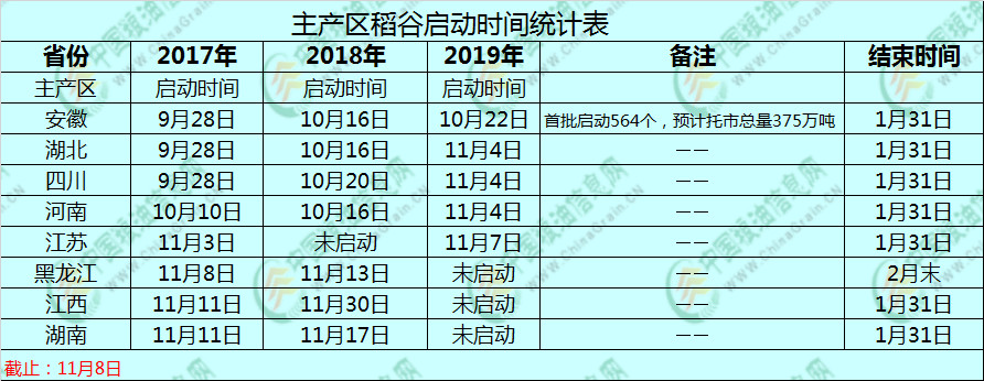 國(guó)家糧食物資儲(chǔ)備局在11月6日發(fā)布通知,同意自11月7日起在江蘇省內(nèi)符合條件的相關(guān)地區(qū)啟動(dòng)2019年中晚稻最低收購(gòu)價(jià)執(zhí)行預(yù)案。隨著托市的啟動(dòng),將給予本省稻價(jià)帶來強(qiáng)有力支撐,使得稻價(jià)不會(huì)繼續(xù)下行。畢竟自十月中旬當(dāng)?shù)匦录就砭旧鲜幸詠,稻價(jià)持續(xù)呈跌跌不休的態(tài)勢(shì),且去年該省輪換糧收購(gòu)價(jià)格高位,托市也未進(jìn)行啟動(dòng)。截止本周五該產(chǎn)區(qū)普通晚粳稻到廠價(jià)格為1.20元/斤以內(nèi),水分16,出米率70%以上低于國(guó)家托市價(jià)。但部分米企和貿(mào)易商反饋,雖然該省份托市啟動(dòng),但整體倉(cāng)容有限,未來稻價(jià)或圍繞托市價(jià)附近小幅波動(dòng),稻價(jià)上漲概率不大。同時(shí)今年新季中晚稻豐產(chǎn),平均畝產(chǎn)可達(dá)到1300斤以上,品質(zhì)好,整體市場(chǎng)處于供應(yīng)充足的狀態(tài),建議該產(chǎn)區(qū)米企擇優(yōu)收購(gòu),農(nóng)戶及時(shí)出售回?cái)n資金,后市稻價(jià)上漲的空間有限。