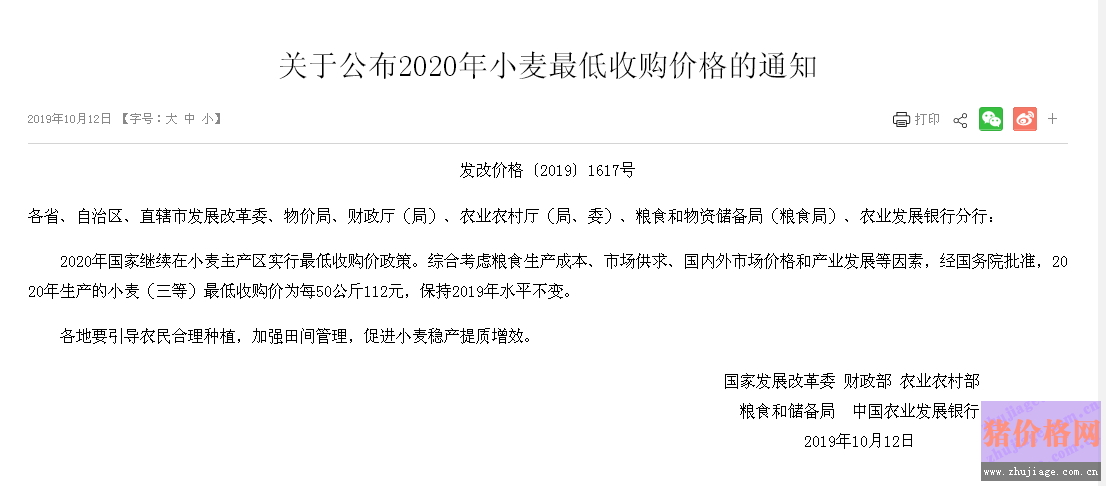 相較于夏糧收購(gòu)期間小麥價(jià)格的不溫不火,近期小麥行情出現(xiàn)了明顯上漲,據(jù)了解目前華北廠家主流收購(gòu)價(jià)格在1.15-1.19元/斤,較9月份上漲0.01-0.03元/斤。近期價(jià)格上漲一方面由于國(guó)慶以來主產(chǎn)區(qū)天氣不好,影響上量;另一方面由于目前冬小麥正處于播種階段,農(nóng)戶在忙著秋播,無暇賣糧。因此近期以五得利為首的大型制粉企紛紛漲價(jià)收購(gòu),吸引糧源。10月份正處于政策敏感期,10月12日國(guó)家糧食和物資儲(chǔ)備局公布2020年國(guó)家繼續(xù)在小麥主產(chǎn)區(qū)實(shí)行最低收購(gòu)價(jià)政策。2020年生產(chǎn)的小麥(三等)最低收購(gòu)價(jià)為每50公斤112元,保持2019年水平不變(如圖所示)。這無疑給市場(chǎng)吃了一顆定心丸,利好后期小麥?zhǔn)袌?chǎng)。那么在政策支撐下,小麥價(jià)格是否會(huì)繼續(xù)上漲?還能漲多少?中國(guó)糧油信息網(wǎng)分析師張艷秋認(rèn)為,短期內(nèi)小麥價(jià)格易漲難跌,但考慮到今年糧食豐產(chǎn),基層余糧充足,小麥價(jià)格將保持穩(wěn)中緩漲,按臨儲(chǔ)陳麥到廠成本估計(jì),預(yù)計(jì)還有0.03-0.04元/斤上漲空間。