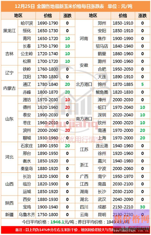 數(shù)據(jù)顯示:12月25日國內(nèi)玉米市場繼續(xù)偏弱運行,東北及港口玉米價格集中下調(diào)10-20元/噸,山東部分企業(yè)玉米收購價反彈10-20元/噸。
