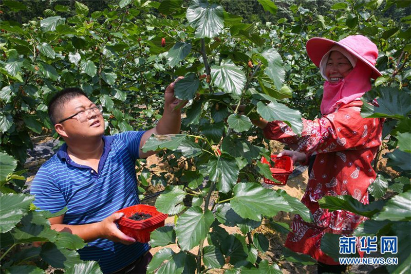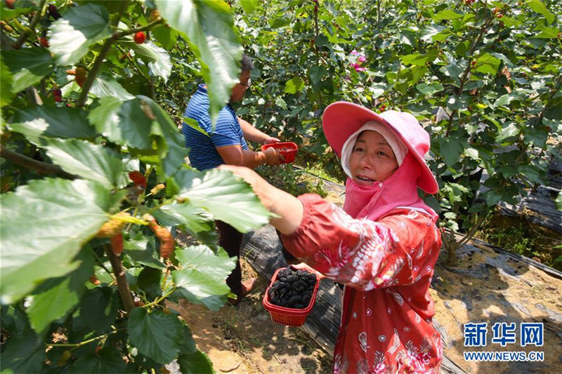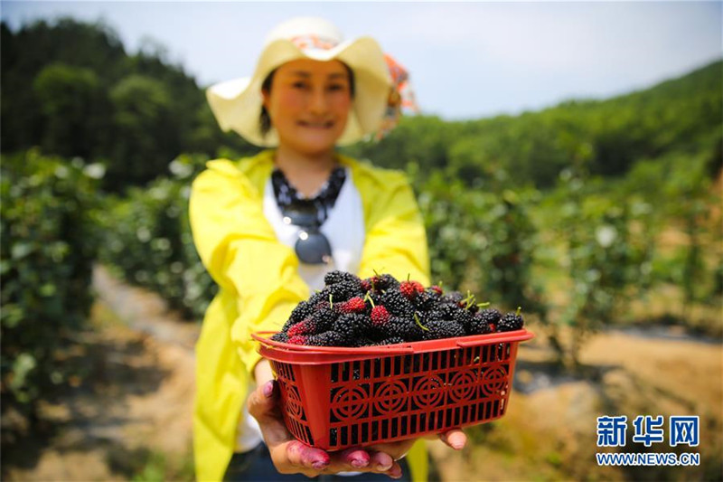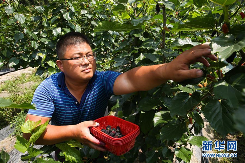 41歲的馮云是江西省南昌市灣里區(qū)梅嶺鎮(zhèn)的居民。2016年,馮云放棄了醫(yī)藥器械公司技術總監(jiān)的高薪職位,回到家鄉(xiāng)創(chuàng)業(yè)。他從梅嶺鎮(zhèn)東昌村流轉(zhuǎn)了近70畝荒地,又從浙江引進了適合采摘的桑葚品種,打造觀光采摘園。今年桑葚園全面掛果,吸引眾多游客前來觀光、采摘,日均客流量超過800人次。當?shù)剞r(nóng)民因此受益,通過土地入股的農(nóng)民可以獲得分紅,在桑葚園務工的農(nóng)民也能增加兩到三萬元的年收入。新華社記者 潘思危 攝