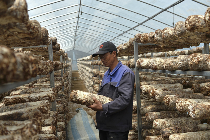 5月19日,農(nóng)民在香菇大棚內(nèi)整理菌棒。