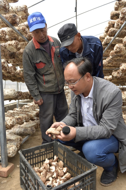 5月19日,專業(yè)技術(shù)人員(前)在香菇大棚內(nèi)對農(nóng)民進行技術(shù)指導。