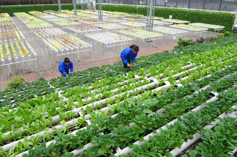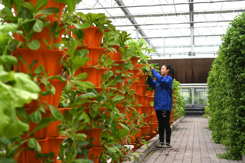 5月18日,工作人員在河北省青縣廣旺現(xiàn)代農(nóng)業(yè)示范園大棚內(nèi)打理無(wú)土栽培的蔬菜。