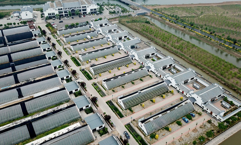 這是5月18日拍攝的河北省青縣廣旺現(xiàn)代農(nóng)業(yè)示范園內(nèi)的蔬菜大棚和餐廳(無(wú)人機(jī)拍攝)。