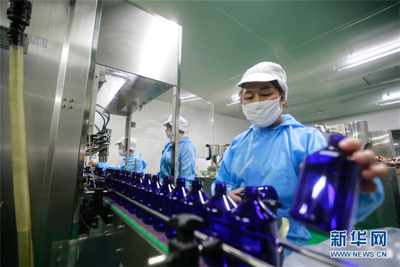 5月19日,在山東淄博臨淄區(qū)皇城鎮(zhèn)一玫瑰加工企業(yè),工人在流水線上罐裝玫瑰露。