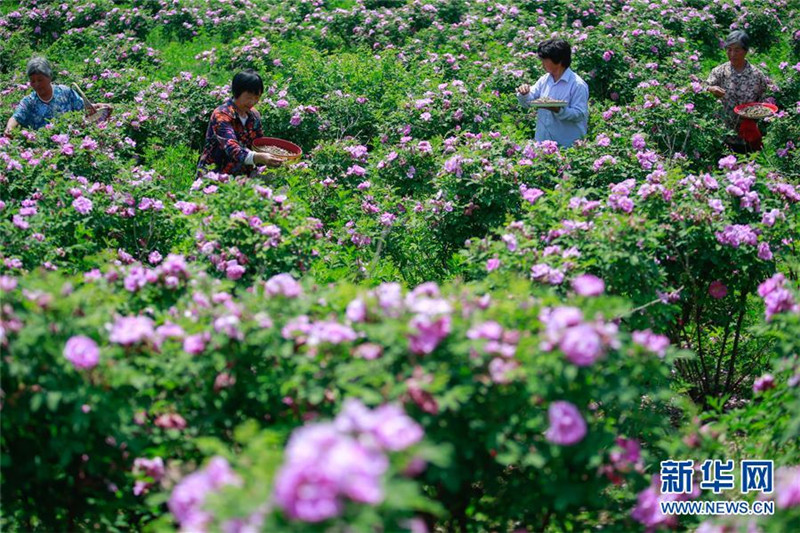 5月19日,在山東淄博臨淄區(qū)皇城鎮(zhèn)玫瑰谷,村民在采收玫瑰花。