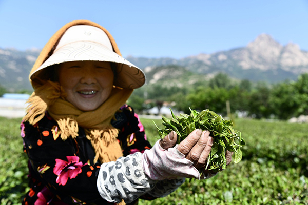 5月19日,在青島市嶗山區(qū)碧海藍田生態(tài)農(nóng)業(yè)有限公司,茶農(nóng)在展示剛采摘的茶葉。