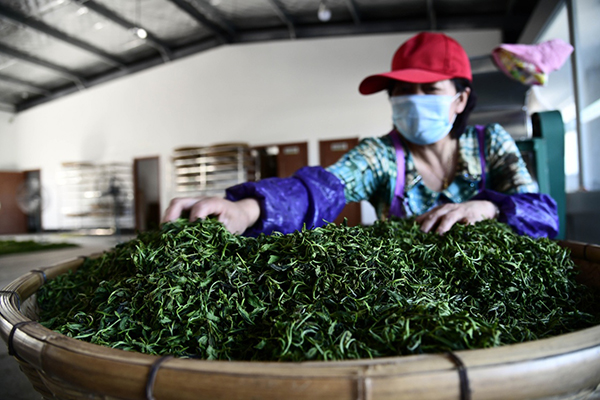 5月19日,在青島市嶗山區(qū)碧海藍田生態(tài)農(nóng)業(yè)有限公司,茶農(nóng)在炒制茶葉。