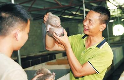 5月22日,張學(xué)斌(右)在西蘭村竹貍養(yǎng)殖場(chǎng)查看竹貍生長(zhǎng)情況。