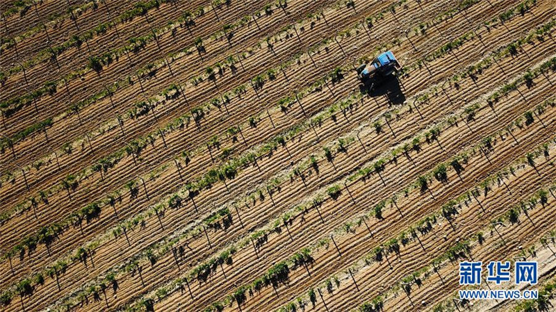 拖拉機在銀川市中糧長城云漠釀酒葡萄種植基地的葡萄架間進行除草作業(yè)(5月22日無人機航拍)。
