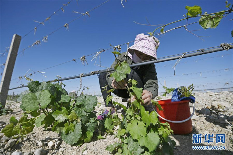 工人在銀川市中糧長城云漠釀酒葡萄種植基地為葡萄藤進行嫁接(5月22日攝)。