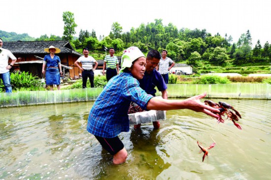 5月22日,在臺江縣臺盤鄉(xiāng)紅光村,村民李文志將領(lǐng)到的小龍蝦苗投放到自家的稻田里。