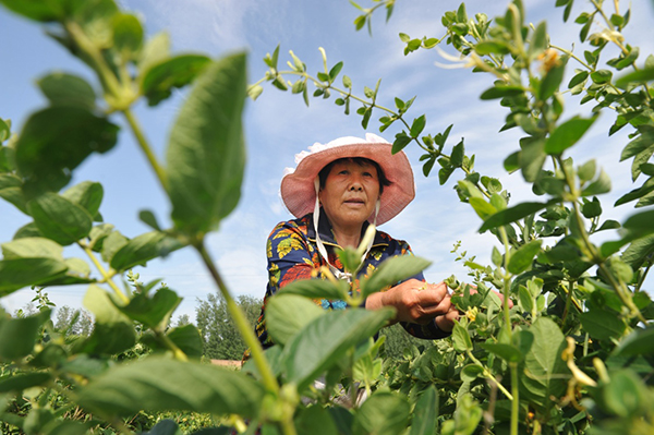 5月27日,河北省吳橋縣鐵城鎮(zhèn)雙井王村農(nóng)民采摘金銀花。