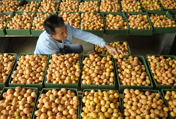 湖北省恩施土家族苗族自治州宣恩縣農(nóng)民種植的枇杷近日喜獲豐收,農(nóng)民正加緊采摘、分級、包裝,交由合作社統(tǒng)一銷售。近年來,當(dāng)?shù)卣膭钷r(nóng)民“帶地入社”,將土地交由枇杷產(chǎn)銷合作社統(tǒng)一種植管理,目前已有6000余畝荒地變成農(nóng)業(yè)觀光園,帶動農(nóng)戶增收。新華社發(fā)(宋文 攝)