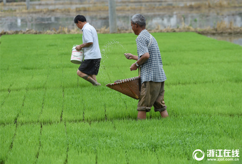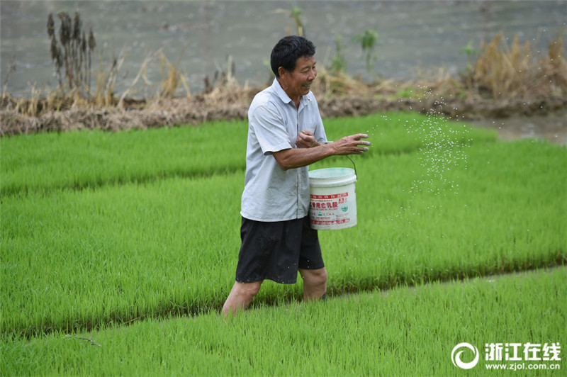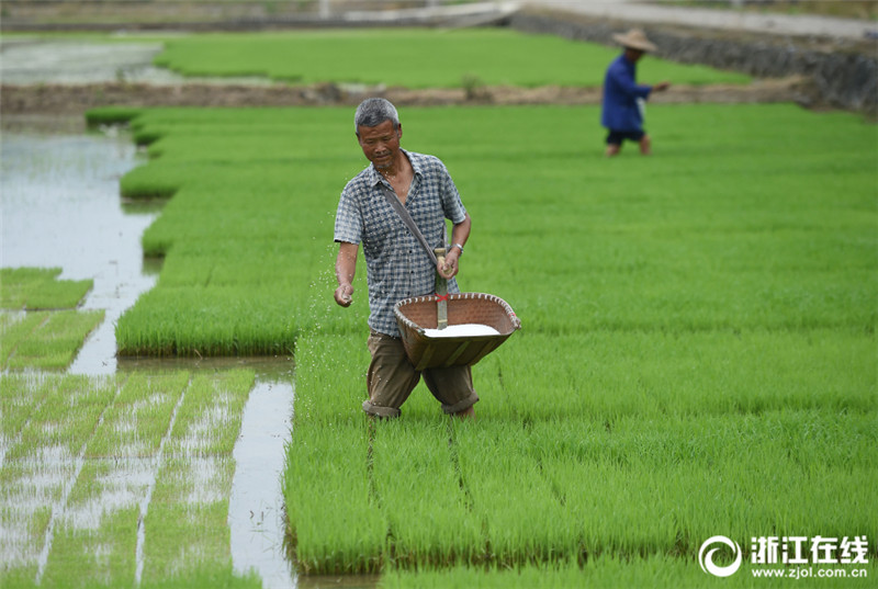 5月29日,桐廬縣分水鎮(zhèn)種糧大戶徐宏亮在保安村承包的田里給秧苗施肥。