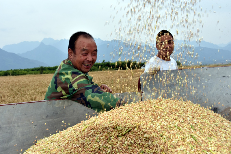 6月1日,陜西藍(lán)田縣湯峪鎮(zhèn)村民將自家收割好的小麥進(jìn)行裝車。