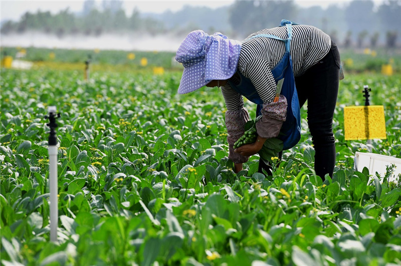 6月3日,在河南省西華縣宋府園林家庭農(nóng)場供港蔬菜生產(chǎn)基地,工作人員在采摘蔬菜。
