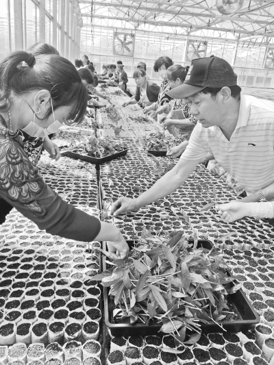 圖為在平泉市七溝鎮(zhèn)歐李產(chǎn)業(yè)基地的智能暖棚內(nèi),技術(shù)人員正在指導(dǎo)貧困戶進(jìn)行歐李嫩枝扦插育苗。劉雪靜攝