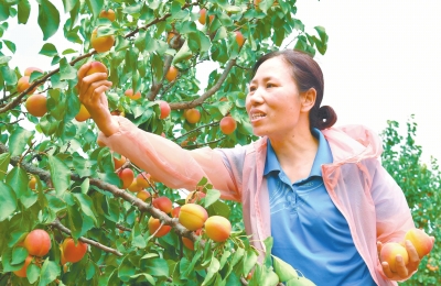 6月9日,在澠池縣果園鄉(xiāng)李家村,一位游客正在采摘仰韶大杏。