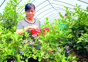 6月11日,在銅陵新橋高科技現(xiàn)代農業(yè)示范園大棚內,種植戶在采摘藍莓供應市場。