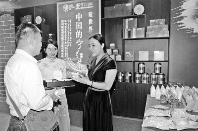 圖為朱麗俐(右)向顧客熱忱介紹寧紅茶。