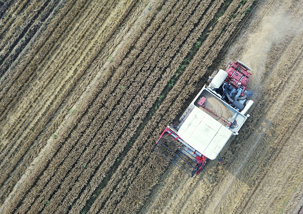 6月13日,河北省河間市景和鎮(zhèn)豐爾莊村農(nóng)民在收獲小麥。