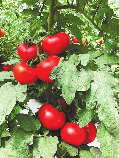 上圖中以高效農(nóng)業(yè)科技創(chuàng)新合作示范園內(nèi)種植的西紅柿,一棵西紅柿可以產(chǎn)果25-40斤。