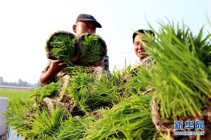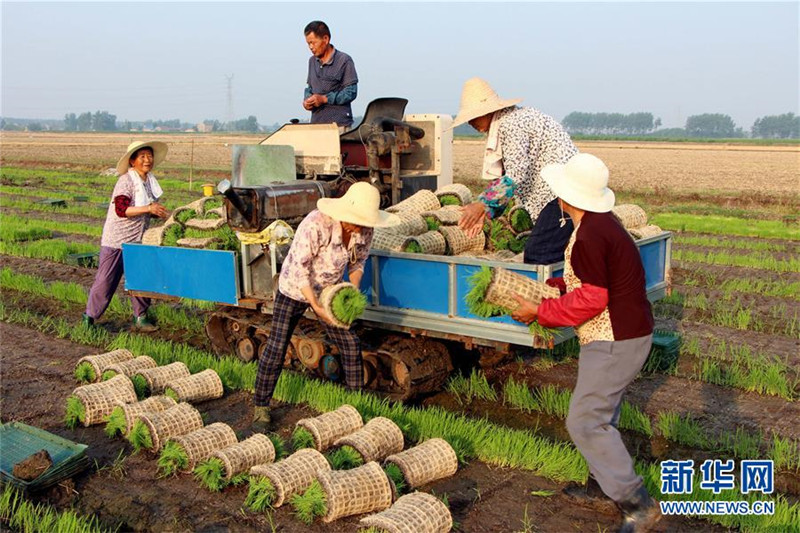 6月14日,安徽省全椒縣一專業(yè)合作社的農(nóng)民在搬運(yùn)秧苗。
