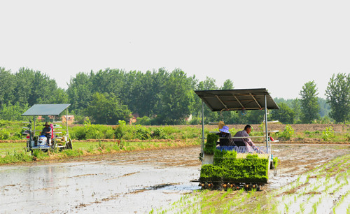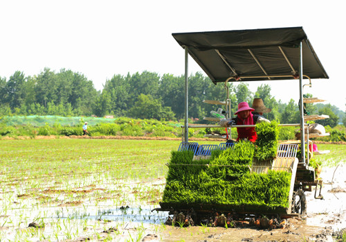 6月14日,在河南省淮濱縣新里鎮(zhèn)孫莊村的水稻田內(nèi),村民正在進(jìn)行機(jī)器插秧;礊I縣是河南省糧食生產(chǎn)大縣,全縣80萬(wàn)畝小麥收割完畢后,廣大農(nóng)民立即轉(zhuǎn)入水稻栽插,農(nóng)田里到處是一片繁忙景象。