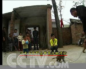 記者:“耍猴可能很多人都見過,但像這種一群人耍一群猴我相信見過的人并不多,其實我們在全國各地所見到的耍猴藝人95%以上是來自我目前所在的地方新野縣,一到農(nóng)閑的時候,這里的農(nóng)民就會帶上自己的猴子出去跑江湖,在出去之前,一般他們都會聚在一起練練手,所以,我們現(xiàn)在看到的其實是一場非正式的比賽,不過是大家在家門口的熱身而已。”
